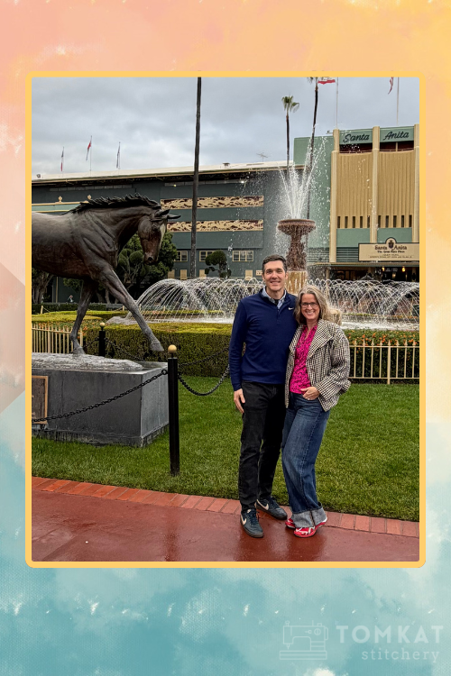 Despite the rain, the full outfit did get its moment—worn together on the final day at the Santa Anita racetrack. Handmade clothes, real life, unforgettable memories.