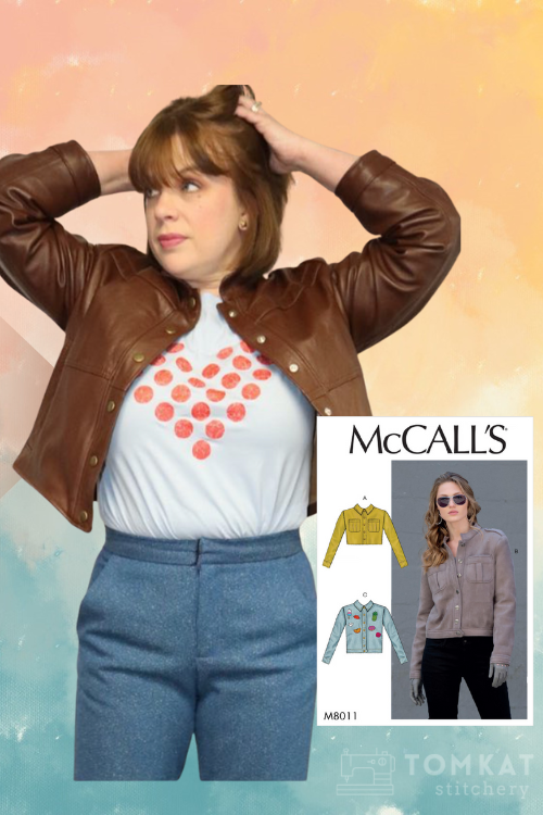 This project started as a thrifted men’s leather coat with burn marks and scratches. I used McCalls 8011 pattern and transformed it to a cropped, chic jacket that feels brand new. I reused the original pockets, added a lining, and made it my own.