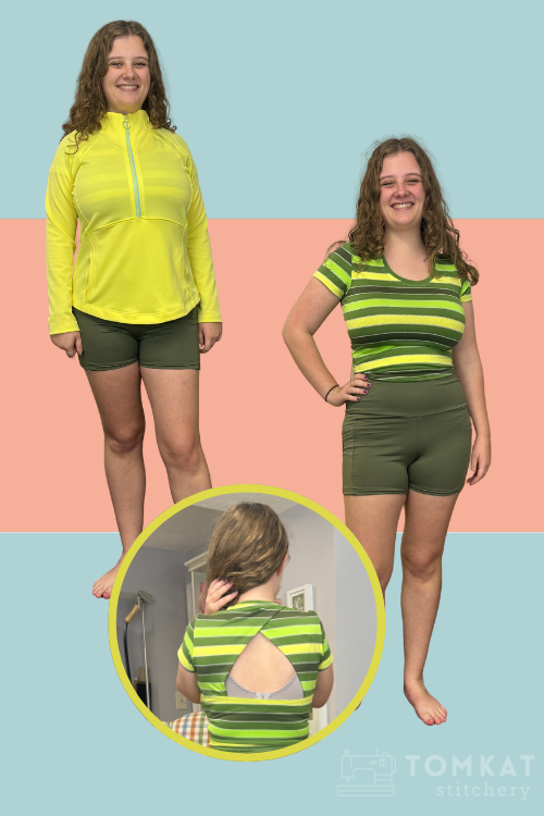 This fabric is great for sports bras, fitted tanks, or bold leggings but would also work beautifully for looser tees. From this fabric, I sewed the Greenstyle Tiny Tee Sewing Pattern with the open-back option so her future matching olive sports bra will peek through. This peak-a-boo back looks so cute on her.