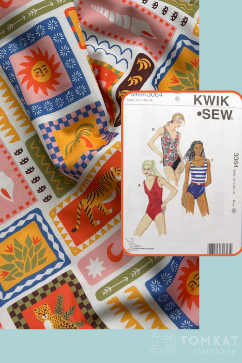 A Florida capsule starts with swimwear. I’m sewing a new swimsuit using a wildly joyful swimsuit knit from Core Fabrics—covered in eclectic motifs and perfectly aligned with my color palette. The pattern is a vintage, outâofâprint favorite with flattering ruching and a crossover front.