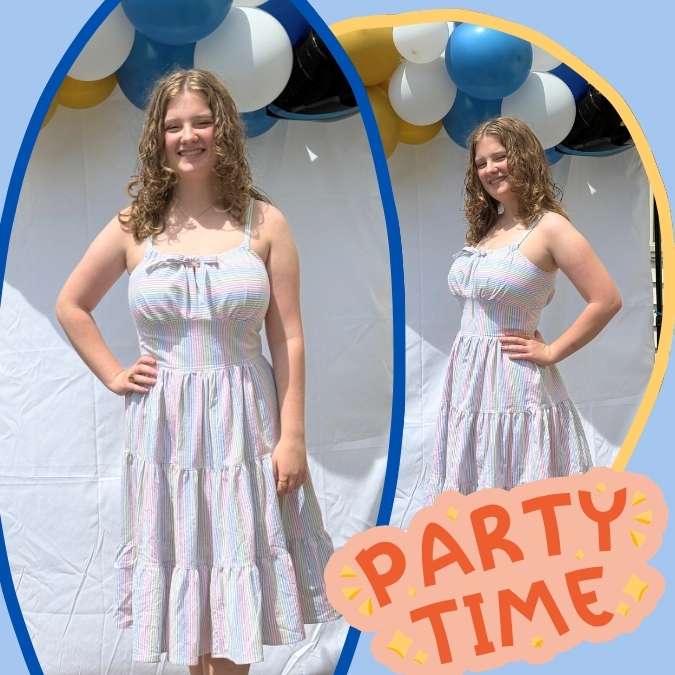 Now, let’s add some spice to this adventure: I had one day — yes, ONE DAY — to sew this dress. Oh, and there were sixteen family members visiting, the party to prep, and my poor dog got sick midweek (she’s thankfully on the mend!). But sewing is my superpower, and I was determined to give my daughter something that made her feel as special as the occasion. We picked the Boardwalk Dress by Charm Patterns from the Charm's Sewing Circle Membership — a beautifully designed vintage-inspired sundress with adjustable straps, a gathered bust, and a flowy, tiered skirt. I used some striped cotton poplin (THIS is similar fabric you can get at 15% off with Code TOMKAT) we had snagged at a Joann's closing sale, and despite a few stripe-matching mishaps (only us sewists notice that stuff anyway), it came together in just over six hours, broken into two interrupted chunks of time.